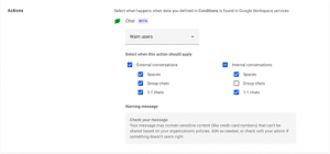 Kini administrator dapat menetapkan aturan DLP (data loss prevention atau pencegahan kehilangan data) untuk Google Chat. Fitur ini dihadirkan untuk melindungi data sensitif agar tidak sampai ke pihak yang tidak memiliki wewenang. Aturan DLP Google Chat sekarang tersedia dalam versi open beta. Itu berarti, admin dapat menggunakannya tanpa perlu mendaftar di program beta tertentu.