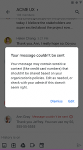Setelah aturan DLP diterapkan, pesan dan file dalam percakapan yang relevan akan otomatis dipindai untuk mengetahui informasi sensitif. Pengguna akan diberi tahu tentang potensi kehilangan data, mencegah file keluar, baik secara tidak sengaja atau sengaja. Admin dapat mengonfigurasi tindakan yang akan diambil sebagai respons terhadap data sensitif yang terdeteksi, seperti: memblokir pengiriman, memperingatkan sebelum mengirim, dan log untuk audit di masa mendatang.