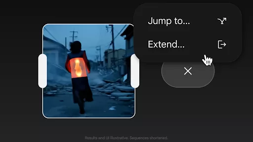 Scenebuilder: Edit dan perluas pengambilan gambar Anda yang sudah ada dengan mulus—tampilkan lebih banyak aksi atau transisi ke adegan selanjutnya dengan gerakan berkelanjutan dan karakter yang konsisten.