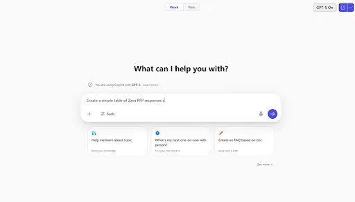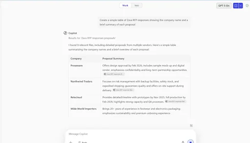 Kemampuan penalaran ganda ini sangat transformatif. Bayangkan Anda adalah tim marketing yang meminta Copilot untuk meringkas tanggapan Request for Proposal (RFP) dari beberapa agensi, tapi, ketika meminta Copilot untuk mengevaluasi dan membuat peringkat RFP tersebut, sistem akan mengenalinya sebagai permintaan kompleks dan beralih ke model penalaran GPT-5.