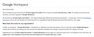 Transisi ini sebenarnya telah disampaikan melalui email administrator layanan. Dalam notifikasi tersebut, Google menyampaikan bahwa seluruh pengguna G Suite yang tersisa akan dipindahkan ke Google Workspace secara otomatis. Untuk jenis plan yang diterapkan akan mengikuti penggunaan sebelumnya di G Suite.