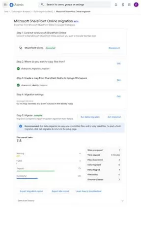 - Anda dapat menemukan laporan komprehensif tentang kemajuan migrasi, termasuk jumlah sites dan file (yang dimigrasikan/dilewatkan). Anda juga dapat mengekspor laporan migrasi untuk penyelidikan kesalahan dan pemecahan masalah.