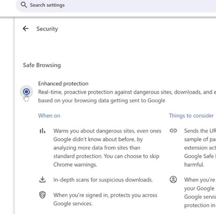 Enhanced Protection bahkan dapat membantu melindungi Anda dari ancaman baru yang tersembunyi dalam arsip terenkripsi. Anda dapat mengaktifkan mode Enhanced Protection di setelan privasi dan keamanan Google Chrome.