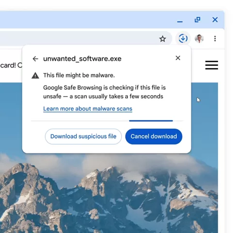 Perlindungan ini tidak hanya menjaga Anda tetap aman saat menjelajah, tapi juga menggunakan teknik AI dan pembelajaran mesin yang canggih untuk melindungi Anda dari unduhan berbahaya. Dengan mengaktifkannya, Safe Browsing menjalankan lebih dari 300.000 pemindaian mendalam terhadap file yang mencurigakan terhadap pemindai canggih setiap bulan, membantu menemukan bentuk-bentuk malware baru yang belum pernah terlihat sebelumnya.