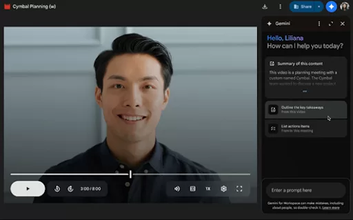 Video berisi banyak informasi, namun menontonnya kembali dapat memakan waktu. Dengan pembaruan ini, pengguna dapat memanfaatkan Gemini untuk mendapatkan apa yang mereka butuhkan dari video mereka dengan lebih cepat. Kini Anda dapat menggunakan Gemini di panel samping Google Drive untuk melakukan beberapa tugas seperti: