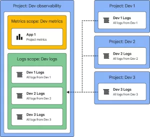 Dengan pengaturan ini, Anda mungkin ingin membuat tampilan observabilitas khusus untuk aplikasi dalam proyek. Metrics scopes dan log scopes memungkinkan Anda melakukan hal tersebut.