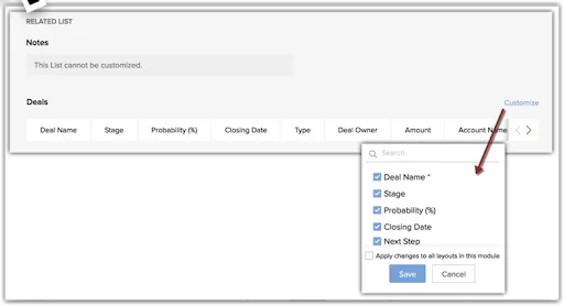 - Tampilan related list – Untuk setiap layout, Anda dapat menampilkan/menyembunyikan daftar terkait tertentu. Anda juga dapat menyesuaikan kolom yang akan ditampilkan dalam daftar terkait dengan menambahkan/menghapus kolom, menghapus item (kecuali catatan dan item yang ditambahkan sebagai bagian dari integrasi, misalnya, Social atau Zoho Projects), dan menyusun ulang urutannya.