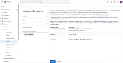Administrator cukup masuk ke konsol Google Admin dan mengaktifkan kebijakan Managed profile reporting. Anda dapat menggunakan daftar di dalamnya untuk meninjau informasi seperti keterangan profil, versi browser, ekstensi yang dipasang, kebijakan yang diterapkan, dan lainnya.