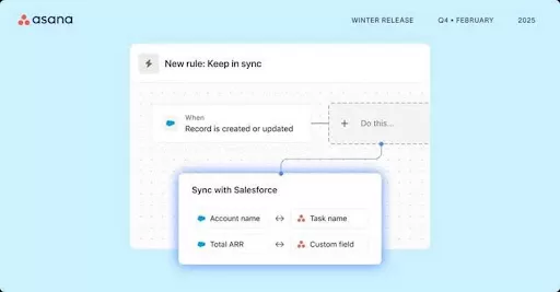 - Sinkronkan Salesforce dan Asana secara real-time. Sederhanakan perencanaan kampanye dan alur kerja penjualan dengan memperbarui data Salesforce secara otomatis di Asana. Tim penjualan dapat memastikan status transaksi diperbarui secara real-time untuk langkah selanjutnya yang diperlukan.
