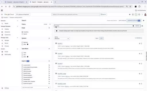 Glosarium bisnis ini dapat diakses melalui tab Glosarium di Dataplex Universal Catalog. Anda dapat mengelola glosarium, membuat asosiasi antara istilah dan aset data, serta mencarinya, semuanya dari konsol. Kapabilitas ini telah tersedia untuk umum. Untuk informasi lebih lanjut, silakan lihat panduan pengguna untuk glosarium ini.